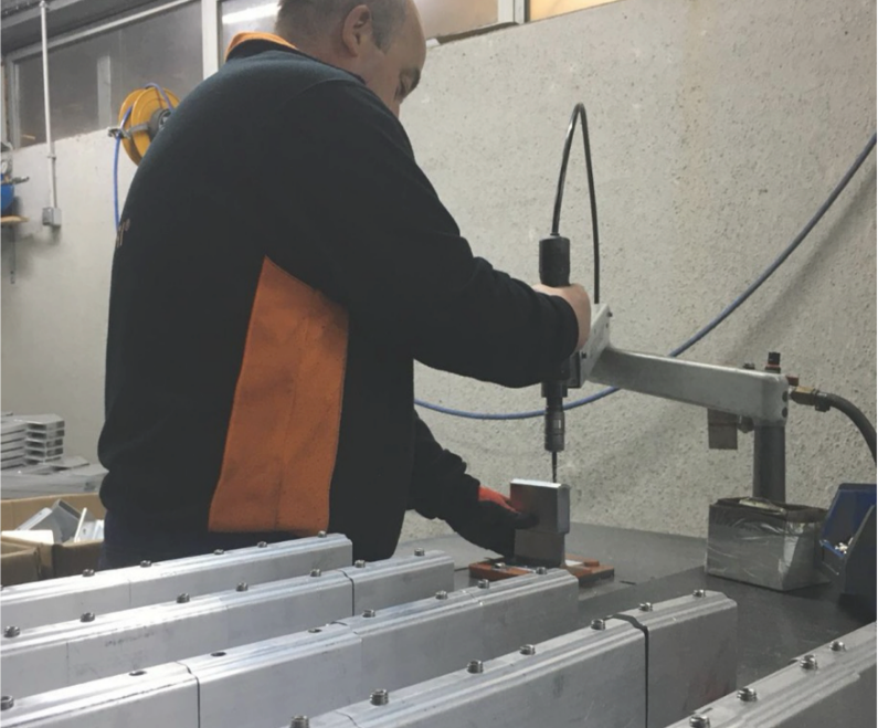 - 3 robots colaborativos y maquinas de diseño propio para el mecanizado y conformado de perfil de aluminio.
